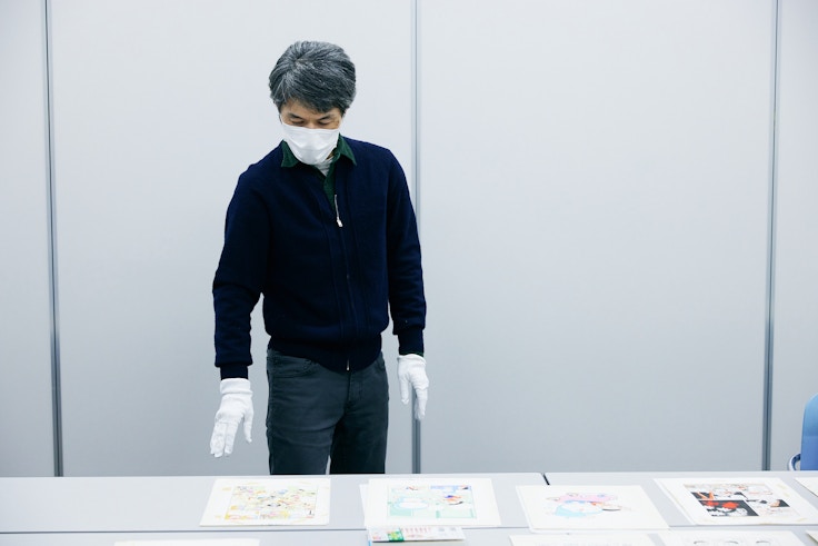 『THE GENGA ART OF DORAEMONドラえもん拡大原画美術館』に収められたもののうち、山口が実物を見たい!と挙げたのは、カラー絵、2色刷り、モノクロページが入り混じる30点の原画。「発表された年代と、コマやカットの性格というのでしょうか、それぞれが違ったものをお願いしました」。取材がスタートすると、静かな部屋に「いやあ……おお、ほお。へええ。ひょお……」という呟きが響く。