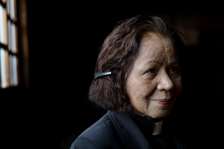 伊波 この写真の女性が石原絹子さんです。キリスト教の牧師で語り部をされています。私が糸満市を撮るようになったのは、「沖縄戦の際、避難した糸満市米須で爆撃に遭い、家族を次々と亡くし、7歳で孤児になった」というお話をお聞きしてからです。