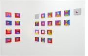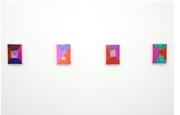 この「誕生日と命日」シリーズは、自分でつくったカラーチャートをもとに、モチーフとする人物が生まれた日と亡くなった日の日付、曜日、天候を色に置き換えて構成したものです。外側の四角形が誕生日、中央の四角形は命日を示し、4つに区切られた領域のそれぞれが日付を表す4桁の数字、領域を囲む枠はその日の曜日にあたります。天候によって各色の色調が決まります。