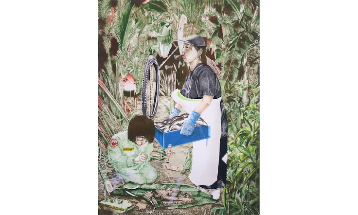 作品は、この新聞記事の内容と、自身が知るかぎりの曽祖父の情報を組み合わせてつくり上げたものです。新聞に載っているガダルカナル島で撮られた報道写真と、曽祖父が出兵前に勤めていた職場(仕出し屋)の跡地に建った鮮魚店の人々のイメージを描きました。曽祖父がいまこの時代に生きていたら、そこで働いていたかもしれないと妄想しました。