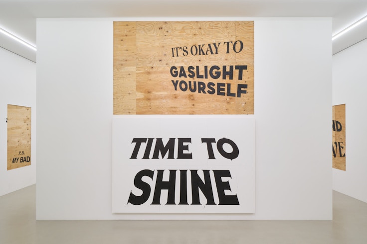 KOTARO NUKAGA(天王洲)で開催されたホーの個展「SOMETHING SO BEAUTIFUL IS SO EASILY FORGIVEN」(2023年4月8日〜6月3日)では、ギャラリーの白い壁に直接レタリングを施し、その部分が石膏ボードごと切り出されていた。石膏ボードはパネルに固定されて「タブロー」と化している。それに加えて、石膏ボードが切り出されることで露呈した壁面にも直接レタリングが施されており、本展におけるホーの作品はこの「タブロー」と「壁画」のふたつのパーツからなる全10点で構成されていた。