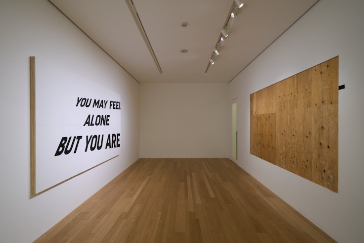 「この『YOU MAY FEEL ALONE BUT YOU ARE』という言葉は、鑑賞者に自然と『NOT』という言葉を期待させます。すると文章の意味は『孤独に感じるかもしれないけど、そんなことないよ』という慰めのトーンになる。でも『ARE』で文章が切れているので『あなたは孤独である』という突き放した意味になっています。ここでぼくが示しているのは、ある文脈で言葉が期待される役割のようなもの。ここでは『慰める』という役割を敢えて投げ出すことによって、『そんなことないよ』という言葉よりもリアルな現実を描いています」。