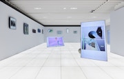 今展はギャラリーの2フロアを用いて展開されている。まずは1階の薄暗い空間に入ると、正対する壁面いっぱいに《Signal RGB(2024 Version)》が広がっている。大きさ・種類ともバラバラな60台の液晶ディスプレイに、スクリーンセーバーが映し出されている。