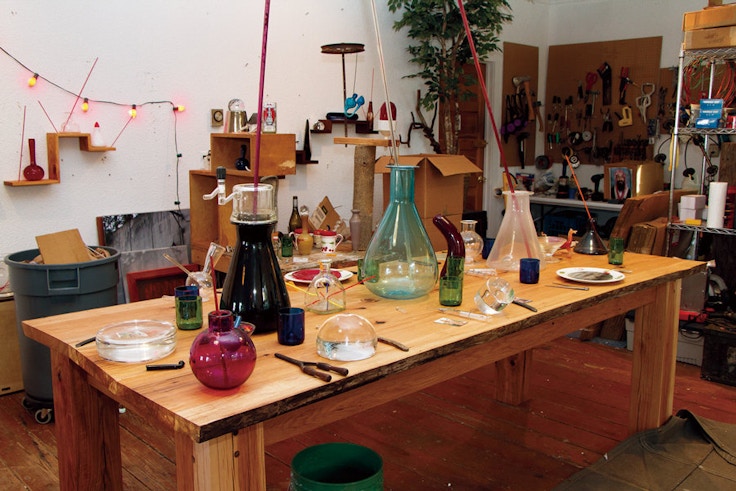 1979年、米国ワシントン州タコマに生まれ、現在はアップステート・ニューヨークのアンクラムデールを拠点に活動するイライアス・ハンセンは、色彩豊かな吹きガラスのオブジェやファウンド・オブジェなど、出自や来歴の異なる素材を組み合わせることで、無数の物語の断片が有機的に結びつきながら散在する、謎めいた実験室のようなインスタレーション作品で広く知られる。一昨年、ヨコハマトリエンナーレ2014の新港ピア会場で発表したカラフルでユーモアあふれるインパクトの強い作品群が記憶に残っている読者も多いだろう。今回、日本初個展「An open door to an empty room.」のために来日した作家に話を聞いた。