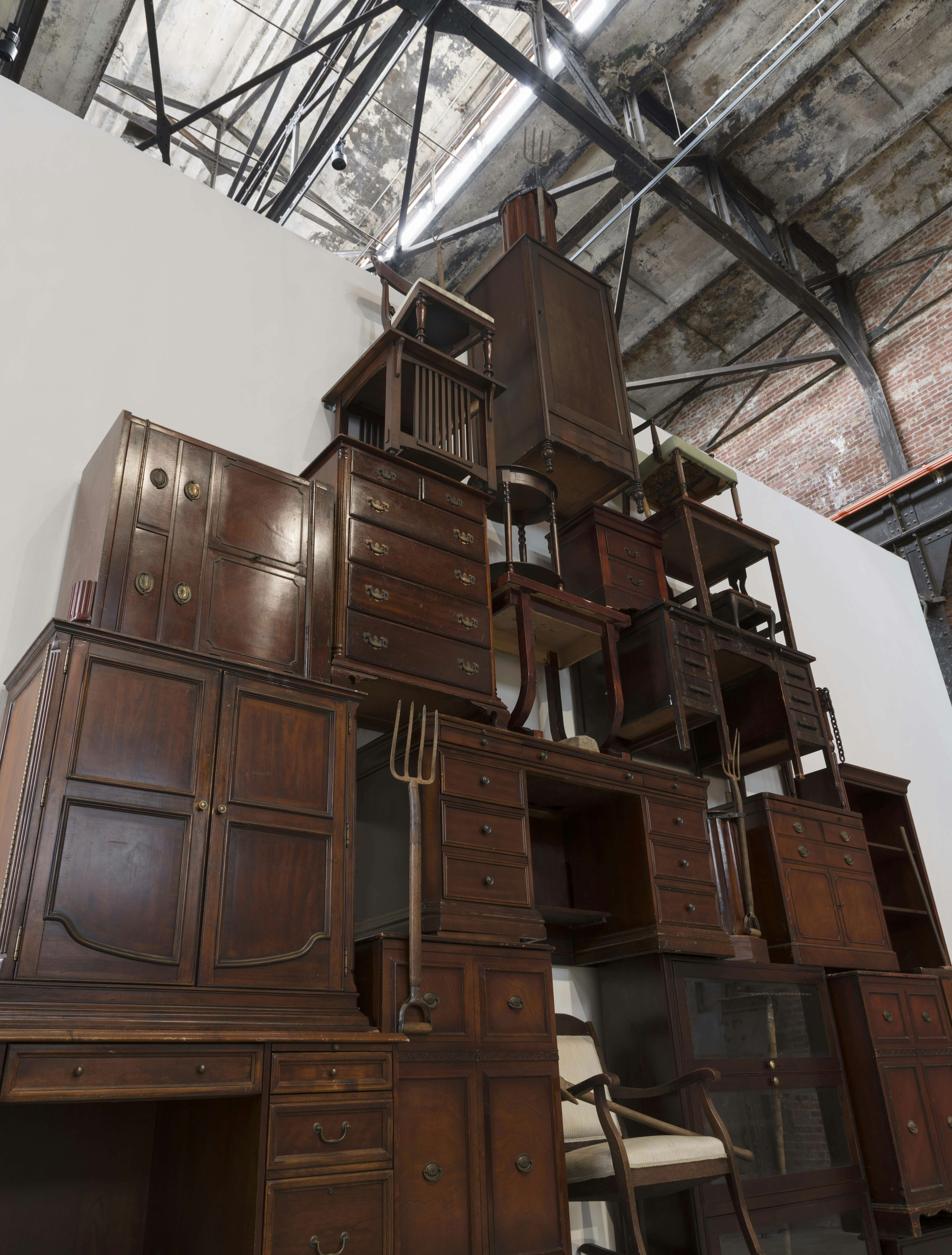 彼女の死を悼む人々にとっては慰めにはならないかもしれないが、ナウマンがバレンタインデーに亡くなったという事実は、どこかふさわしいことのように感じられる。再利用された家具による拡張的なマルチメディア・インスタレーション、彫刻的アッサンブラージュ、粒子の粗い映像、さらにはパフォーマンスなどを通じて、ナウマンは、理想化された上昇志向を帯びた消費文化、過激なイデオロギー、そして現代美術が交差する地点を導き出してきた。そこには鋭い批評性と同時に、開かれたユーモアがあり、それはもはや「愛」に近いものであったと言える。波打つCDタワーや、サルバドール・ダリ風に溶けた時計といった奇妙なポストモダン的装飾を手がかりに、東ドイツ社会主義の崩壊と、再統一後のハイパー資本主義的なドイツにおける排外的ナショナリズムの台頭との絡み合いを暴き出す──そのような試みを行える作家が、ほかにいただろうか。あるいは、アメリカの新自由主義からドナルド・トランプのファシスト的な「MAGA」運動へと至る軌跡を、有名な『原始家族フリントストーン』のカートゥーンを経由して読み解くといったことができるというのか。鋭い政治分析を行いながらも、作品のなかで来場者が自撮りを撮影し共有することを歓迎していたナウマンは、自身を批評対象の上位に置くことは決してなかったのである。