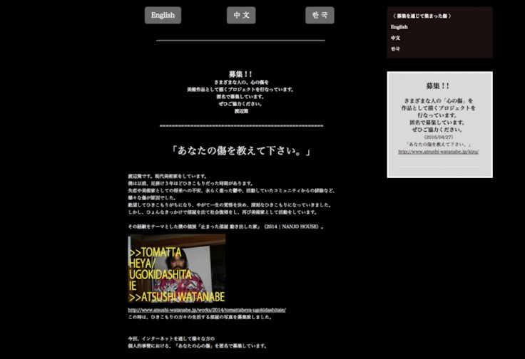 「あの番組(の視聴者)には傷の当事者がいるだろうな」と思って出演しました。「あなたの傷を教えて下さい。」はライフワークとしてやりたいプロジェクトなんです。それをまずインスタレーションで展示すると。それに今回の「黄金町バザール」はアジア人作家が多く参加しているんですよ。彼らの母国語で、彼らの国のSNS上のつながりを通して、募集文の拡散を別の言語でしてもらえればと今動いているんです。アジア各国の言葉での募集文を集めたいなと。