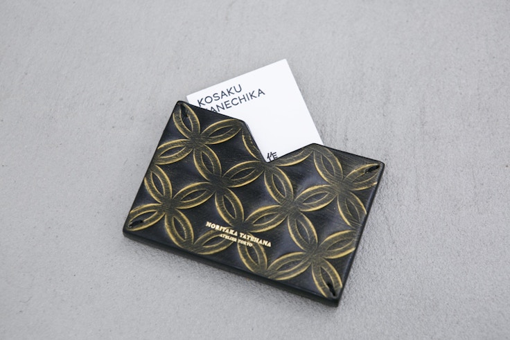 独立に際して舘鼻則孝さんがつくってくれた名刺入れです。皮革の表面には世界各地で古代から存在、日本では七宝柄(しっぽうがら)と呼ばれ、ルイ・ヴィトンのモノグラムにも近似性が見られる模様が。東西の文化を作品に取り込む舘鼻さんの視点が反映されています。