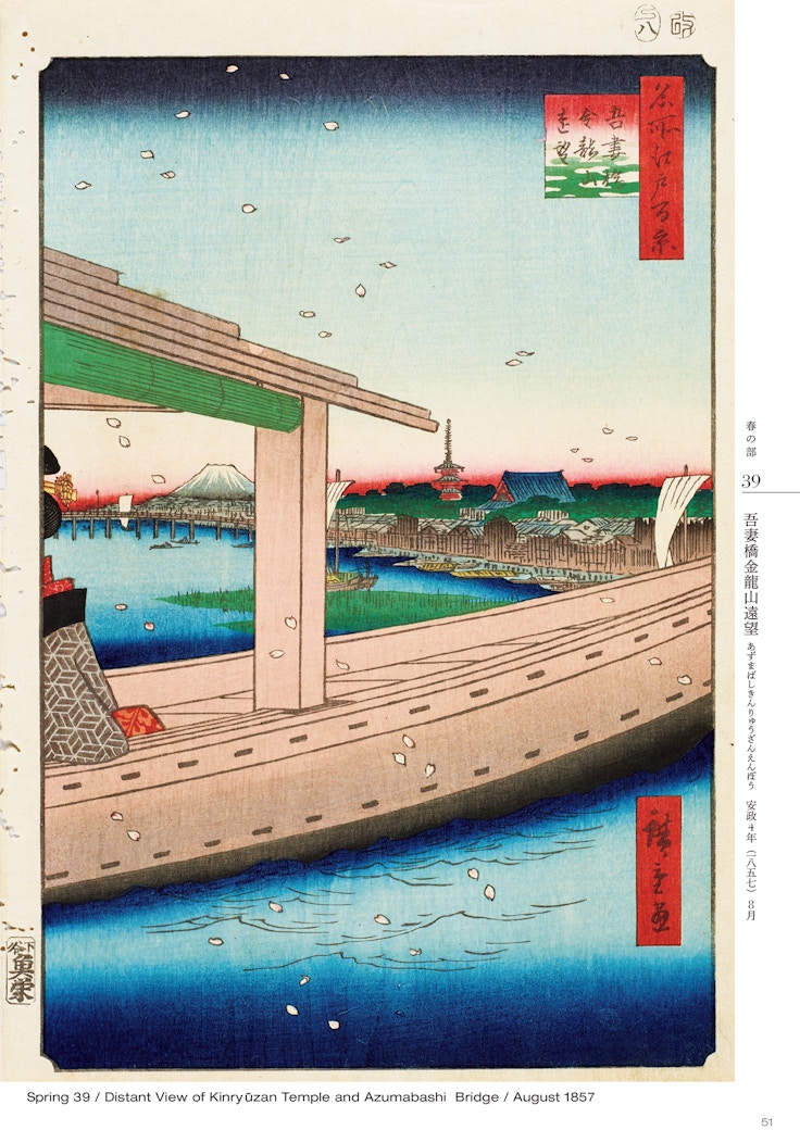 渡邉 そうですね、39番「吾妻橋金龍山遠望」でしょうか。この作品からは、映画のワンシーンを見ているような動きが感じられるんです。船に乗った女性がかなり手前にいて、後ろ姿がほんの少ししか入っていない。そのため船が動いている様子がわかる。桜の花びらがひらひらと舞っていたり、水面にも動きがあったり。遠くの風景もなんとも味わい深い。