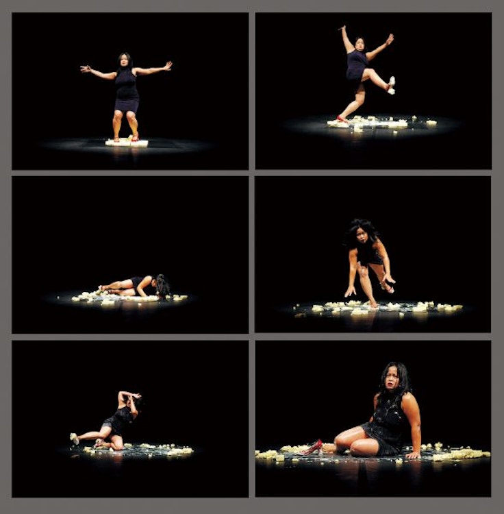 スルヨダルモの身体を支配する動きの体系に対して、彼女の選ぶプロップは極めて西洋的な視覚言語によって構成されている。「ドイツで毎日食べることになったなじみのない食材」としてバターが現れ、ドレスやハイヒールといった性差を示す「障害」に躓き、自らの身体の動きが絡め取られる。イヴォンヌ・シュピールマン(*2)は、これを「アジア人女性を玩弄するような西洋の差別に抗して」と表現しているが、本作にかかわらずミシンや衣服といった素材、作家が18枚のマットレスに挟まれた《わが眠らぬ暴君との対話》(2012-13)など、衣食住に関わる家内労働を参照し、フェミニズム・アートのほとんど伝統的とさえ言えるアイテムを意図的に用いているのは明らかだろう。これらの象徴によって表されているのは、抑圧、排除、服従などの状況であり、また《石の疎外》(2012)で端的に示されているように、アイデンティティの喪失や帰属する先のない孤独といったテーマが繰り返される。そこには経済のグローバル化による搾取構造への視点、たとえば家政婦として雇われ疎外化した身体が影を落とす。