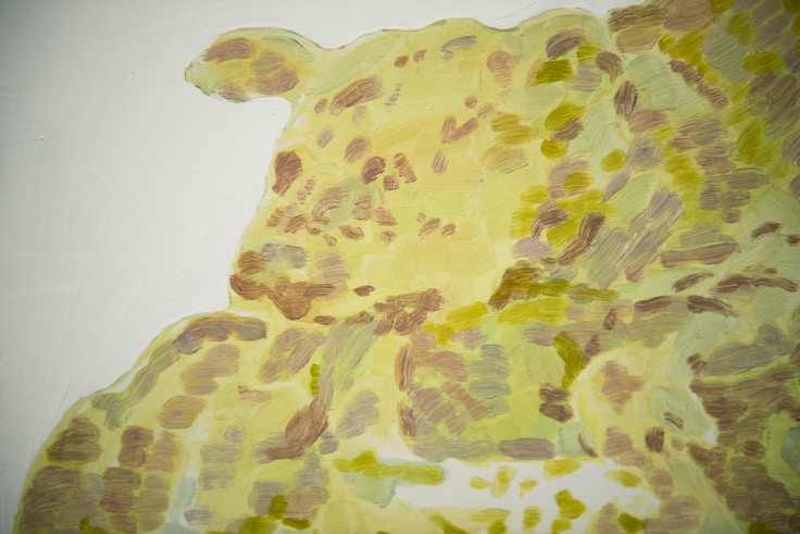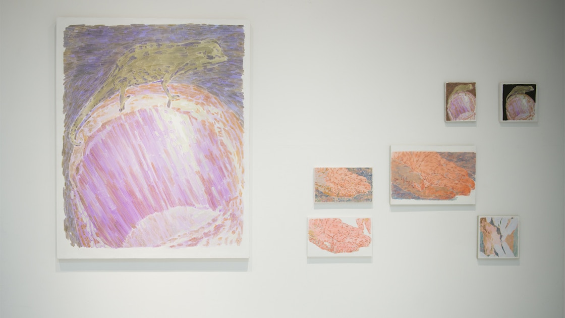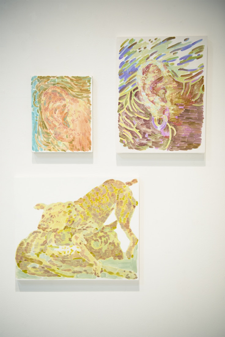個展会場に足を踏み入れると、大小様々な絵画作品が壁に並ぶ。同じモチーフが縦に並んでいたり、離れたところに異なるサイズで展示されていたり、色鮮やかな絵画がちりばめられた展示構成はリズミカルだ。よく見ると、肌荒れして赤くなった手のひらや噛みつき合ってボロボロになった犬など、「美しい」や「カワイイ」といった表現とはあまり縁のないものが主題に選ばれている。ネットサーフィンをしてモチーフを探すのだという。