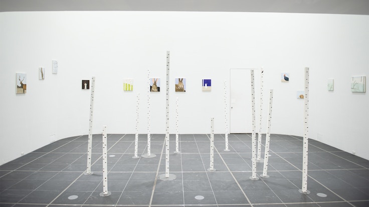 ふと目に入った4〜5色の絵具の組み合わせから、ムンクの《叫び》に描かれた空の色を連想したムラタは、いろいろな形の木材に貼り付けたキャンバスに色を載せ始めた。細長い小さな支持体であっても、ムンクを知っている人であればその色の組み合わせから《叫び》を想像できるのではないか。「小さい空」にはそんな思いが込められている。画面の形をどこまで変えても絵画は成立するのか、そんな実験的な気持ちがムラタを制作に向かわせる。