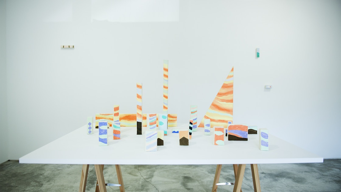 今回、GALLERY SIDE2とTHE GINZA SPACEでは、新たな試みとして手がけた作品を発表した。細長い角材や三角の木材などにキャンバスを貼り、自立する作品だ。インスタレーションとして発想したのか尋ねると、あくまでも絵画として発想したのだという。