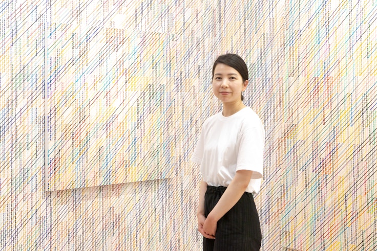 グラフィックデザインの経験をしてみると、本当に細かい表現をmacやイラストレーターで追求できてしまうことが面白くないように思えてしまいました。逆に、できる限り制御したうえで生じてしまう染織の滲みや歪みに、本当は惹かれていたのだということに気づかされたんです。ただ、なんとなく染織をそのまま続けるのは違う、自分には自由が足りないという気がしていたので、東京藝大の先端芸術表現科の修士課程に入って試行錯誤し、博士課程の途中でグリッドペインティングを描き始めました。布を制作するよりもこの手法で見せるほうが、自分が染織から感じている美しさをシンプルに伝えられるのではないかと思って、絵画という手法を選ぶようになりました。