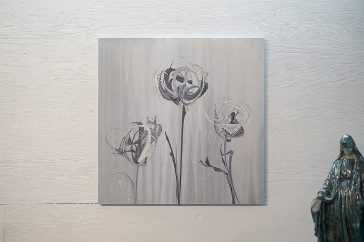 中西 なるほど。でも僕はKotaroさんのその手法にどっぷりハマっていくやり方が、Kotaroさんらしくておもしろいと思っているんです。テクスチャーにこだわりまくって、質感をなんとかコントロールしようと試行錯誤して、その過程をすごく楽しんでいるのが作品から伝わってくるんですよ。手法でとことん「遊ぶ」ための土台とするために、モチーフは偶像やスカルといった普遍的なものにこだわっている面もあるんじゃないですか?