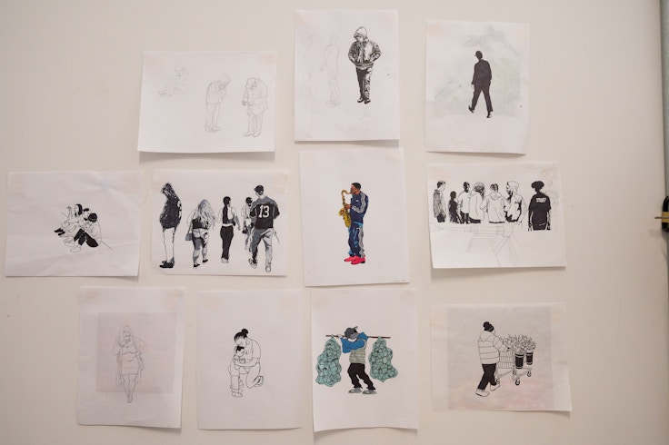 ニューヨークの日常のなかで美しいと思う光景をよく目にするのですが、そこで何を美しいと感じたのかを紐解いていくと、例えば夕暮れ時に様々な人々が行き交うなか、親子で手をつなぎながら歩く暖かい要素もあれば、そのすぐそばで佇むドラック中毒者やホームレスの姿など、そうではない要素も含まれています。このように様々な要素が共存するひとつの美しいシーンに生まれる調和とカオスを、自分の視点でどのようにとらえるかが自分の絵の主題です。というのは、風景画を通じてその均衡状態を表すのに、見た風景をひとつの方向で写生するだけでは自分がとらえたい空気感は表現できないからです。