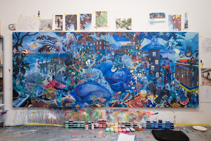 この絵は西洋画のフォーマットなので、本来であれば時間が左から右へ進むよう設定されるべきなのですが、あえて日本の絵巻物のように右から左へと時間軸が流れるつくりになっています。右側では、近所のデリの周りに集まる人々の姿を描いており、このあたりは洛中洛外図のような構成にしています。左のほうに進むと、僕の家とアトリエが混ざった風景があって、画面の中央で眠る人物は妻がモデルになっています。画面の左側にあるのは、好きでよく通っているロッカウェイ・ビーチの風景です。古い武器庫や廃墟が多くありグラフィティ・ライターたちが訪れる場所で、廃屋の屋根にある砲弾の穴にはウクライナ戦争のイメージを重ねています。