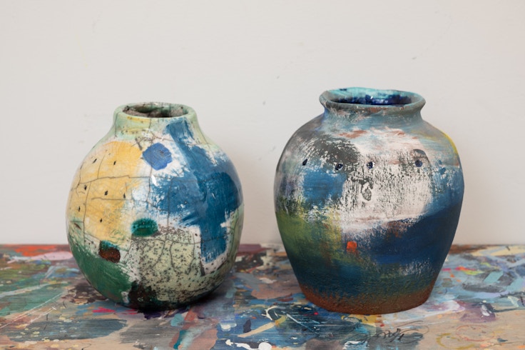 写真右側の作品《あの土地に星と緑を》は、電気窯でほぼ予期した通りに色が出ますし、ガスや薪に比べるとかなり発色が良いので、色をたくさん重ねたい私にはすごく合っています。写真左側の作品《空高く》は、陶器の種類としては、Raku-firingと呼ばれるガスで焼くもので、日本の楽焼とはまったく異なります。Rakuならではのひびが絵の一部となるところや、2時間ほどで焼けるという大雑把さ、スピーディーさが、ニューヨークらしくて気に入っています。表面のひびは焼いているうちに出てくるもので、こうした自分ではどうにもできない要素があるなかで、どれだけ自分の表現ができるのかが新しい挑戦でもあります。
