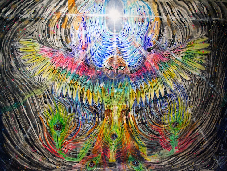 「ある出来事に対する怒りや悲しみの感情で闇を描いていたら、画面のなかに自然と光が生まれてきた。闇が行き過ぎると光になるのではないか、と理解しました。闇と光、自然とデジタル、そうした両極端なものを合わせることが調和につながるのではないかと」。