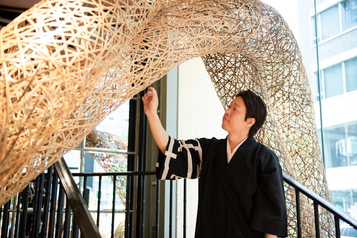 田辺 父は竹工芸、母は漆工芸家に生まれたので、やはり私の根本には工芸があり、思想の根本には「守(しゅ)・破(は)・離(り)」という教えがあります。まずは四代目の田辺竹雲斎として日本の伝統を継承し、次の代につなげないといけない。いっぽうで、伝統は同じことの繰り返しでは廃れてしまうので、革新も必要です。和歌『利休道歌』にも「破るとも離るるとても本を忘れるな」という言葉がありますが、できるだけ伝統から離れながらも、初代から受け継ぐ技法や、土・自然に感謝するという精神性を大事にすることで、アイデンティティをつねに保つことが大切なのです。私が世界基準の現代アートや、NFT(非代替性トークン)、自動車、建築とのコラボレーションに取り組んでいるのはそのためです。これらは工芸家のイメージからは離れているものですが、日本独自の様々な「道(どう)」や、竹雲斎が代々守ってきたもののなかで離れたり戻ったりを繰り返すことで、竹のさらなる可能性が広がっていくのです。