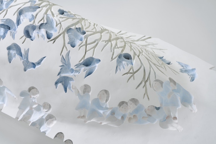 東京・代官山のアートフロントギャラリーで「中谷ミチコ:デコボコの舟 / すくう、すくう、すくう」が開催中だ。2010年代以降、精力的に作品発表を重ねてきた中谷の立体作品は、レリーフの凹凸に着目することが多い。一般的なレリーフは凸部分、つまり出っ張りによって事物を造形するが、中谷作品は逆だ。凹凸を反転させ、凹みによってモチーフを表す。すると、凹んで何もないはずの空間にモチーフが存在することとなり、そこは不在と実在が同居する不思議な空間と化すのだった。新作を含む多様な中谷作品が観られる個展の会場で、本人に話を聞いた。