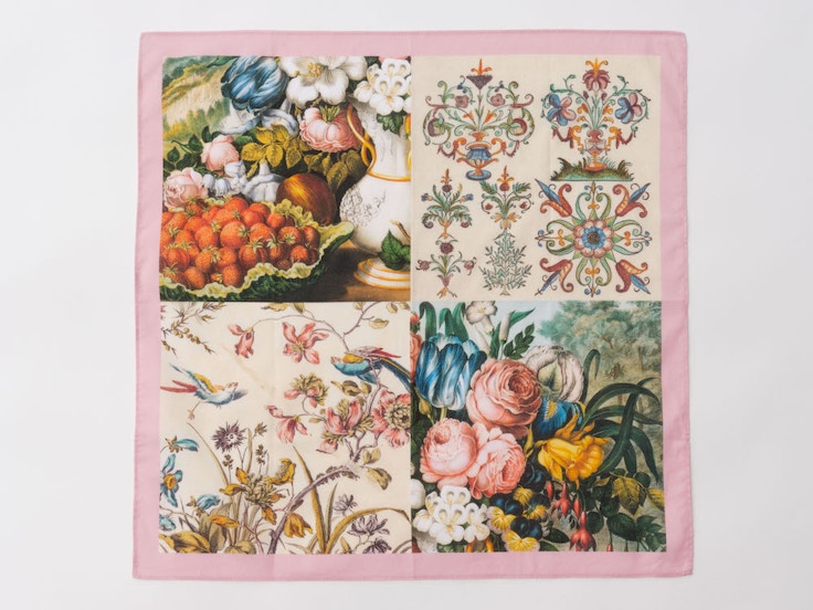 複数の作品を組み合わせたアイテムもある。19世紀にアメリカで活躍した石版画家、フランシス・フローラ・ボンド・パーマー(1812〜1876)や18世紀フランスの画家、ジャン・ピルマン(1728〜1808)、16世紀末から17世紀初頭に活動したドイツのデザイナー、アンドレアス・ブレトシュナイダー(1578頃〜1640頃)がそれぞれ描いた花の絵を組み合わせたハンカチやクリアファイルだ。「時代も国も表現の仕方も異なる植物をクローズアップして組み合わせる。とても大胆で面白いですね。濃密な描写もあれば、シンプルな表現もあるし、抽象化された文様もある。見ていて楽しくなってきます」。