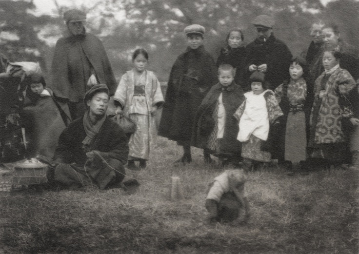 《猿廻しの図》も彼の独特な観察眼がわかる作品です。猿や猿回しの芸人がモチーフというよりも、彼らを見る子供たち、その後ろにいる大人、立場が違う人物たちの視線が交錯する様子にレンズは向けられています。なにかを「見る」という行為を安井は冷静に見つめている。初期の代表作のひとつです。