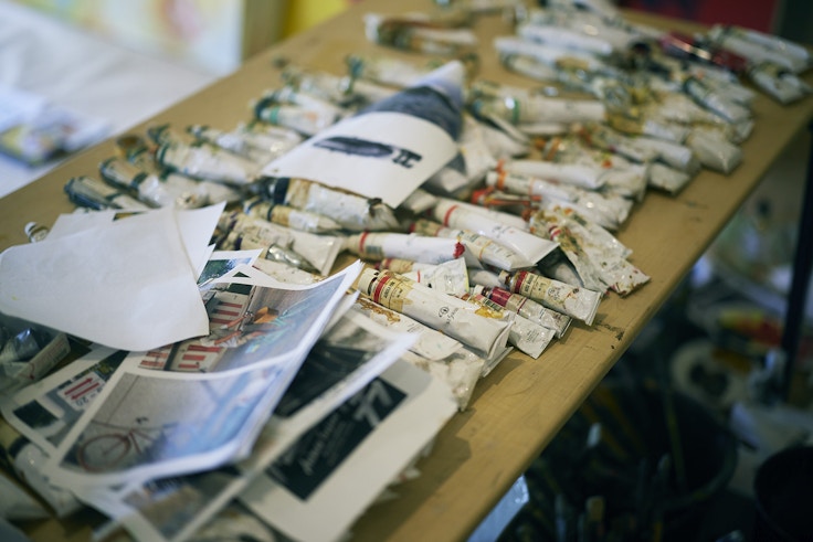横尾 僕はいつも平面の作品をつくっているでしょう? それが立体化されて、例えば洋服だったらそこに人体という要素が加わって、身に着けた人が都市空間に出て行って、さらにひとり歩きしていきますよね。そうやって作品がどんどん姿を変えながら行動範囲を拡張していくのは、非常に興味深いことです。僕のなかでは1枚のキャンバスの絵として完結しているわけで、当初、絵を描いているときはそんな発想は全然ないですから。その後は他人のもの、あるいは社会のものになって、社会的な機能を勝手に持ち始めるものですが、僕はそれを追っかけたり、執着したりすることはほとんどないんですよ。