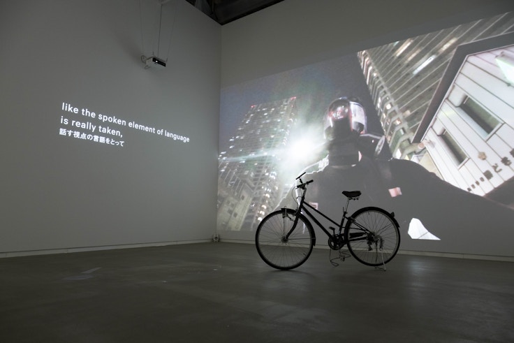 会場では、大掛かりなものからこじんまりとしたものまで、様々な装置が「しゃべって」います。例えば、展示作品のひとつ《つぎはぎの言語》では、中国・四川からベルリンへ亡命してきた詩人のインタビューの翻訳作業から、個人と社会の距離を考えさせられます。また、新作の《Appeartus》は、壁面に投影される映像と自転車型の装置からなるインスタレーション。装置を通じて話すと壁面に口元が大きく投影されて、唇が自分のものではないような感覚に陥ります。