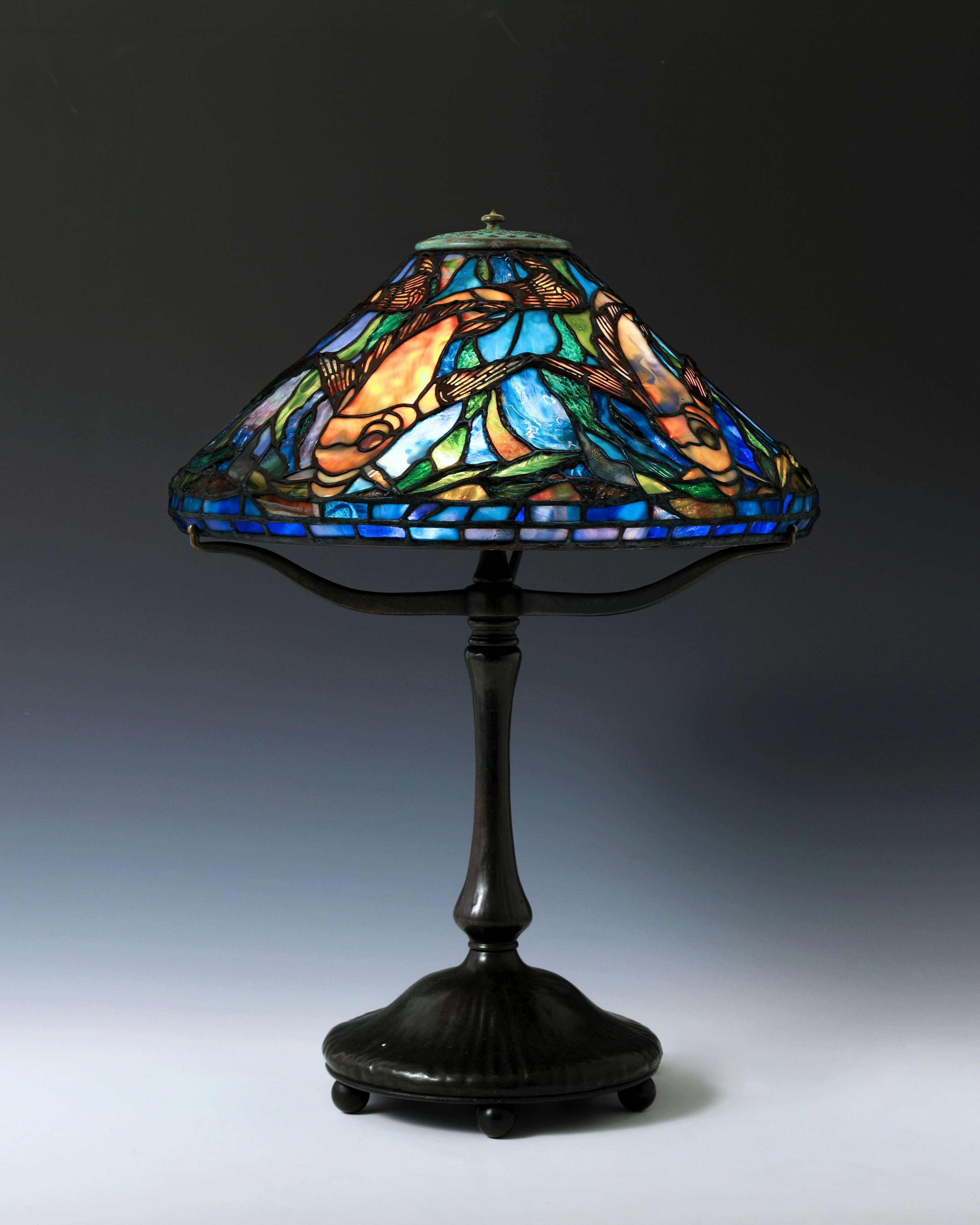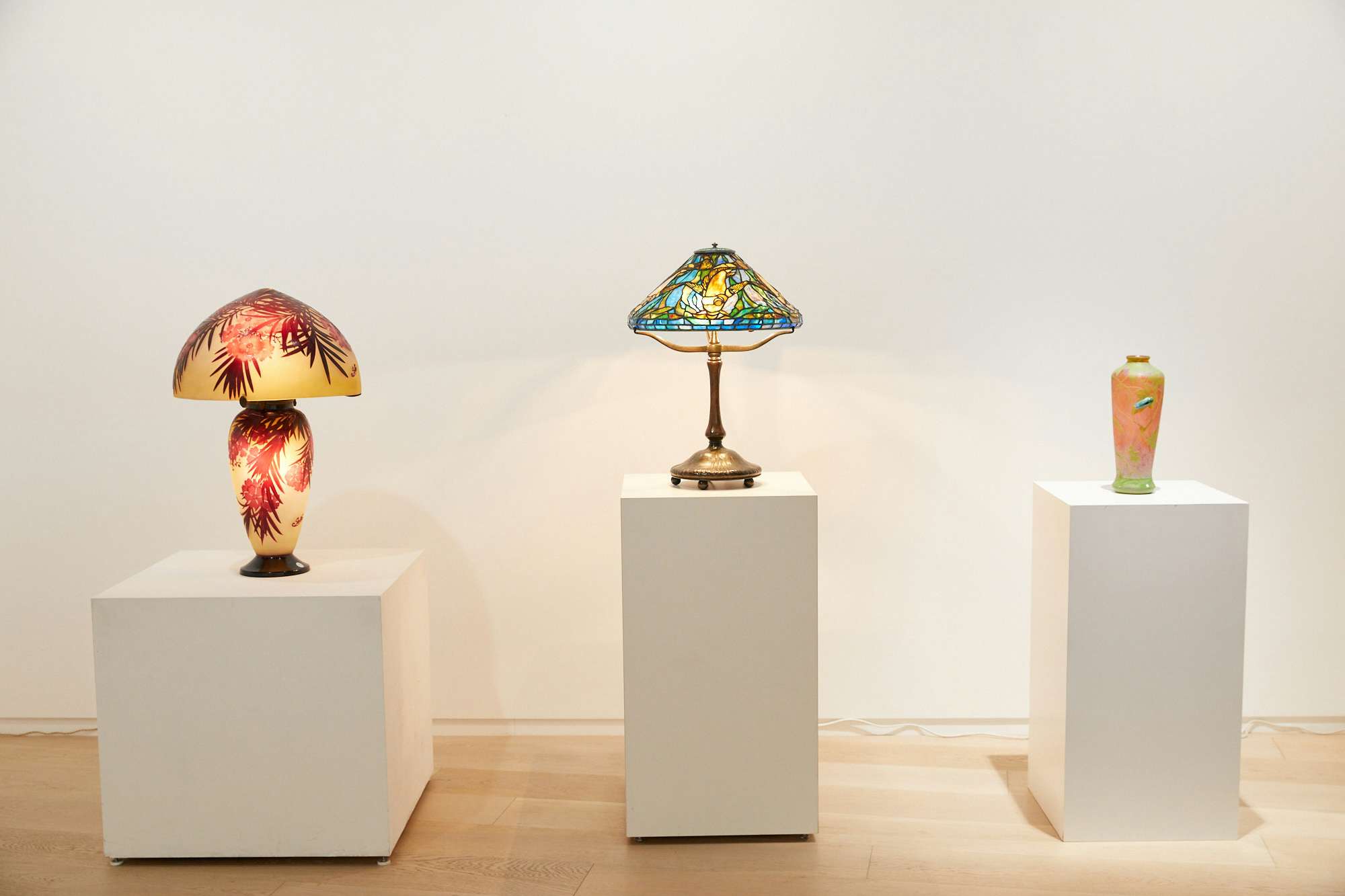 左から東西ニューアートの朝倉卓也氏(専務取締役)、工藤綾女氏(営業部長兼西洋担当の)、後藤美和氏(東洋美術担当)、鈴木かほる氏(ジュエリー担当) ベルナール・ビュッフェ 小さな帽子の道化師 1978 Lot. 111 左からエミール・ガレ《シャクナゲ文ランプ》、ティファニースタジオ《魚文テーブルランプ》、ドーム兄弟《蝉と朝顔の葉、麦穂文花瓶》、 ティファニースタジオ 魚文テーブルランプ 1900-1910 ルイ・ヴィトン マル・クリエ 100 2つのトレー付 Lot.195 2 / 9