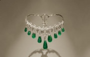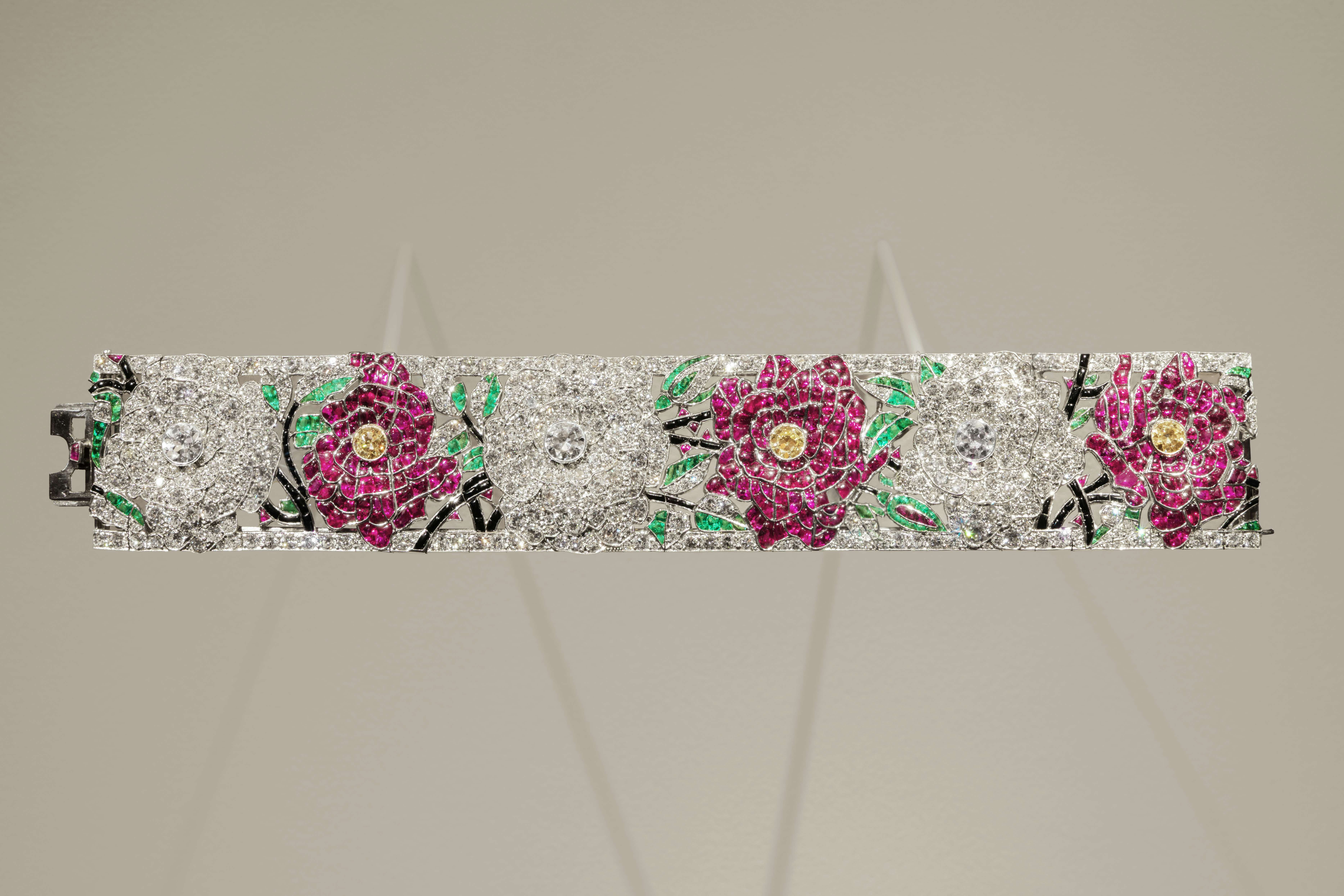 「アール・ヌーヴォーからの流れで自然のモチーフを用いながら、そこに幾何学的なデザインを加え、モチーフをパターン化したのがアール・デコの特質です。このブレスレットは赤と白のローズの意匠が一列に並んでいますが、一つひとつの花の造形が異なります。パターン化されたモダンなデザインを取り入れながら、職人的な手仕事の良さも残しているわけです。これを身につけた女性はあらゆるディテールを見ながら楽しみが尽きないことでしょう。近くに展示された《ローズ ブローチ》(1925)は、石によってバラの花弁の盛り上がりがつくられていたり、茎の部分をオニキスの黒で縁取ってあったりして表現豊かです。輪郭までストーンで描いてしまおうという発想がすばらしいです。また、「喫煙室」の《コルレット》(1929)は、バゲットカットやエメラルドカットのダイヤモンドが輪を成すなかに、大粒のエメラルドがいくつもグラデーションで配されています。インクルージョン(宝石内の内包物)が見えて、小宇宙のようで吸い込まれそうです。当時は天然のインクルージョンの美しさを存分に楽しんでいたのですね。同じくエメラルドのブレスレットもあり、ダイヤモンドの規則的・幾何学的な並びが背景となって、エメラルドの美しさと存在感を引き立てています」。