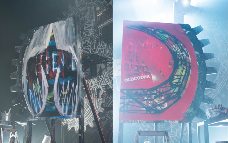 車のギアをモチーフにハンドペイントが施された舞台装置と、ステージの両端に設えられた2枚のキャンバスが、空間に異質の生っぽい手触りを放り込んでいた。YORKE.は、キャンバスに抽象的な線や図形、象徴的なワードをブラシで描いては、また下地を塗り直し、イメージを重ねていく。