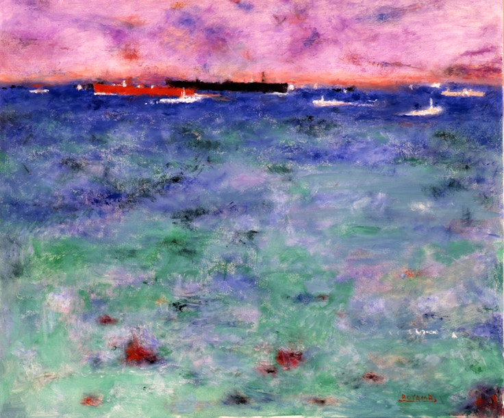 デフォルメされた人や動物が登場する幻想的な初期作品から、92歳で帰国した後、ふるさと横須賀の海を描いた「浦賀水道」シリーズまで、70年以上にわたる青山の画歴をたどる。