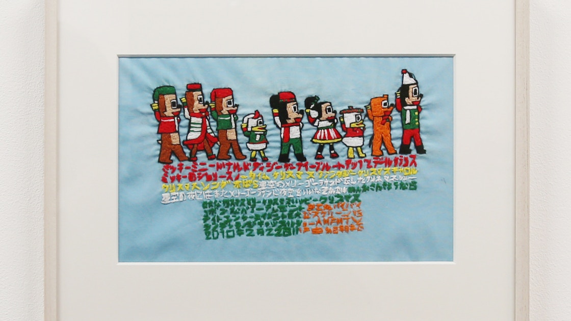 本展では、2009年前後の数年間制作していた、パレードを刺繍で再現するというシリーズを紹介。アメリカのネズミ風のキャラクターたちが、その解説文字とともに整列する姿をひと針ひと針刺繍した作品群は、キャラクターたちの生命、そしてそれに対する川戸の感動を再現している。