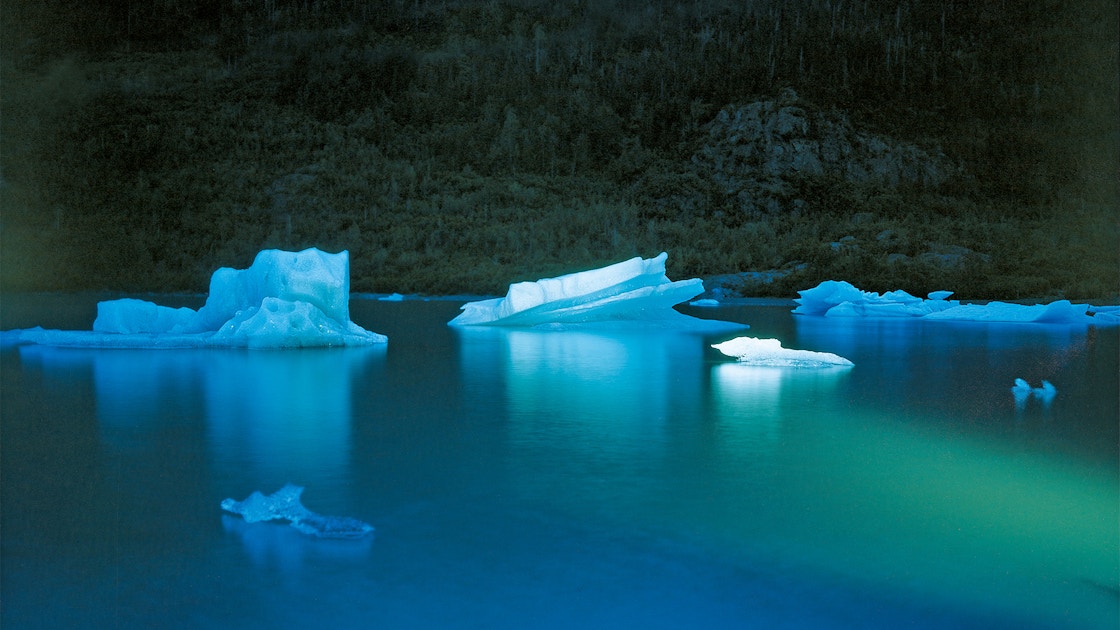 本展でもそのコンセプトは徹底され、極夜の薄明かりのなか、アラスカとアイルランドの氷河にLEDライトを照射して撮影したシリーズ「MIddle of the night」を発表。「人工」のライトに照らされた「自然物」の姿を写し取っている。さらにこのシリーズに加え、「実在」の流氷の写真を合成加工し、「架空」の巨大な流氷に仕上げたパノラマ写真作品を展示。切り取る風景や、作品を仕上げる手法の中に息づく「相反するものの共在」を提示する。