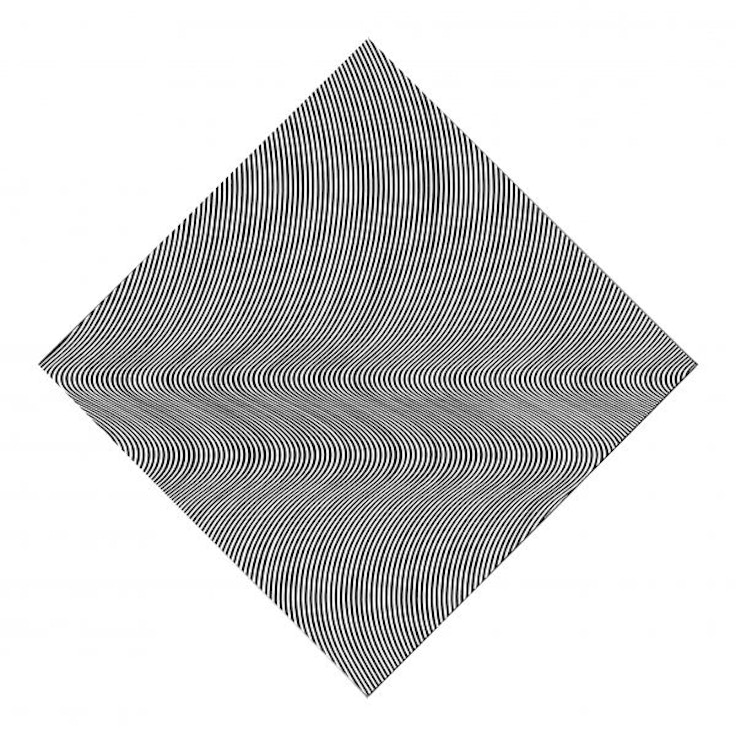 幾何学的パターンによって画面に動きをもたらす抽象絵画で知られるイギリスのアーティスト、ブリジット・ライリー(1931〜)。ロンドンのゴールドスミス・カレッジとロイヤル・カレッジ・オブ・アーツに学んだライリーは、卒業後、教員や商業美術の仕事に就きながら作品を制作を続ける。初期作品はジョルジュ・スーラに影響を受けた風景画だったが、ルネサンス以降の巨匠や印象派の絵画、点描技法の研究を重ねて単純化・抽象化のプロセスを学び、独自の創作を深めていった。