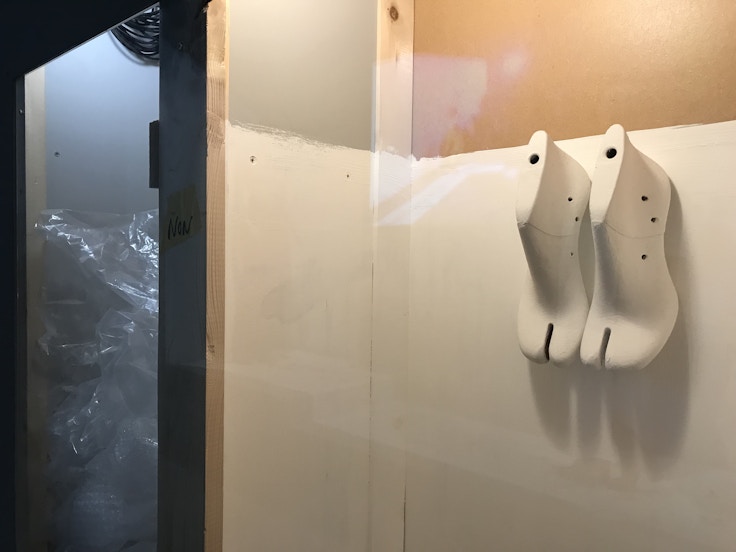 展示構成は年代順というオーソドックスなものだが、内容は100体ほどのルックや、アイコニックなタビシューズの歴史、ショーの映像や、マルジェラの製品で埋め尽くされた部屋のインスタレーションなど、さまざまな視点からその革新的なクリエイションを見ることができる。