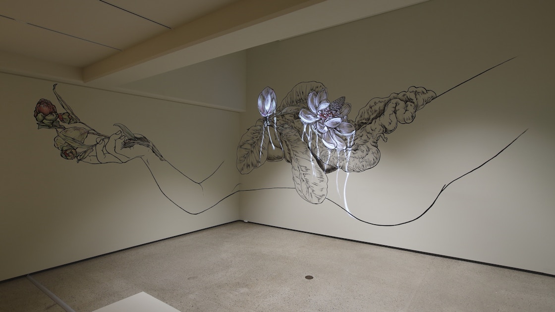 浮世絵を思わせる色彩やタッチで日本社会や内面世界を象徴的に描く束芋は、前述の個展で、内臓や骨の一部に花をいけた「flow-wer」シリーズのドローイングを発表。本展では、同シリーズから17年8月にハマー美術館(ロサンゼルス)で発表後、個展に合わせて再制作した、ウォールドローイングとプロジェクションを掛け合わせた作品を継続して展示する。