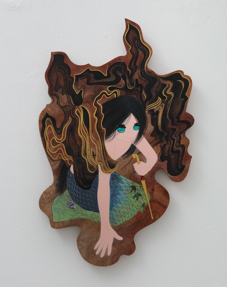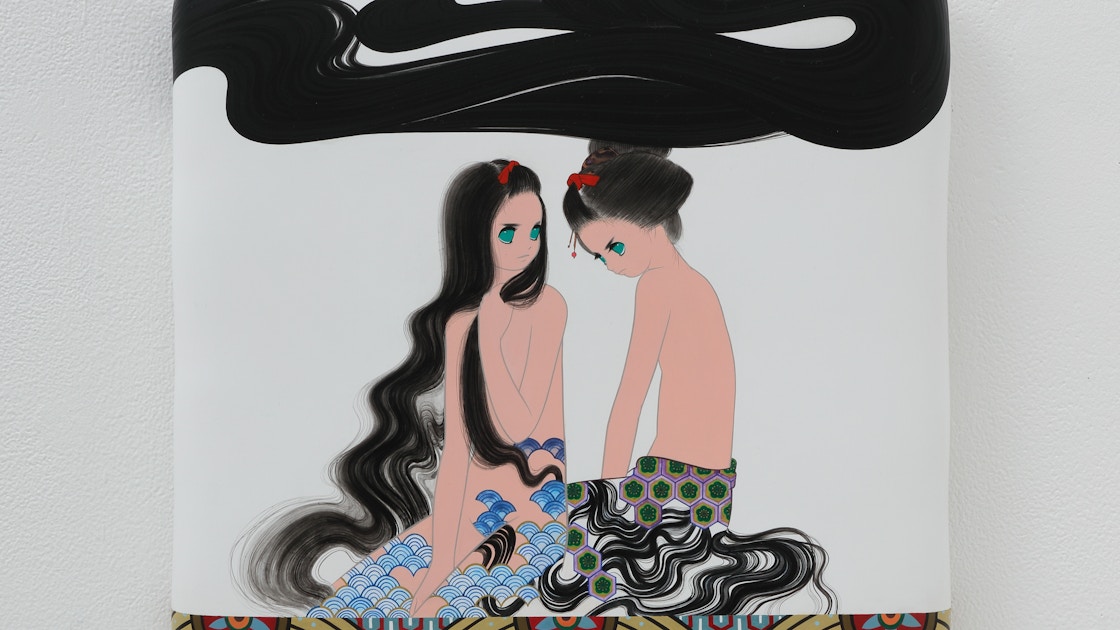 山口藍は東京都生まれ。江戸時代を彷彿とさせる「とうげのお茶や」で暮らす遊女たちの姿を通し、「ただひたすらに美しいと感じられるものがつくりたい」という思いのもとに独自の世界観を構築。パネルに毛布を用いた山口特有の「ふとんキャンバス」をはじめ、和紙や板、貝殻、陶板など、様々な素材を通じてその世界を提示してきた。