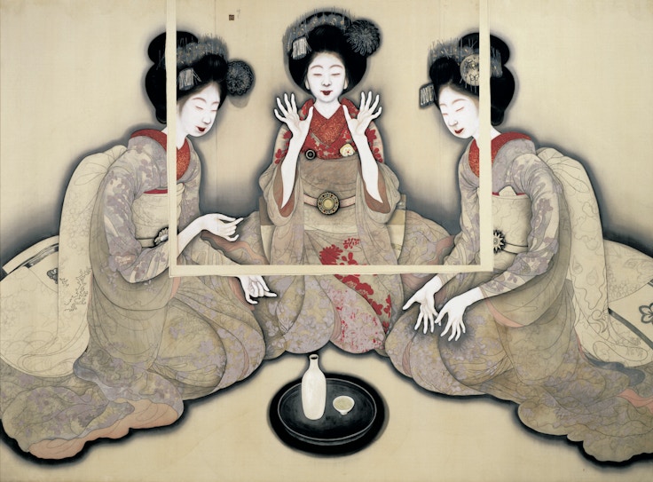 本展では、出世作となった《口紅》をはじめ、未完の作品「拳を打てる三人の舞妓」のシリーズや、本展で初めて紹介される屏風《五女遊戯》などを展示。寡作で知られる神草の数少ない完成作が可能な限り集められるほか、素描・下図・資料類約100点が並ぶ充実の内容だ。