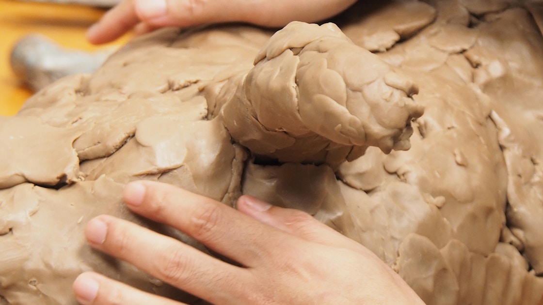 同展出品作品の制作では、中ハシは日々触れ合っている愛犬をモチーフにし、アイマスクをすることで視覚を遮断し、触覚だけで造形することを試みたという。