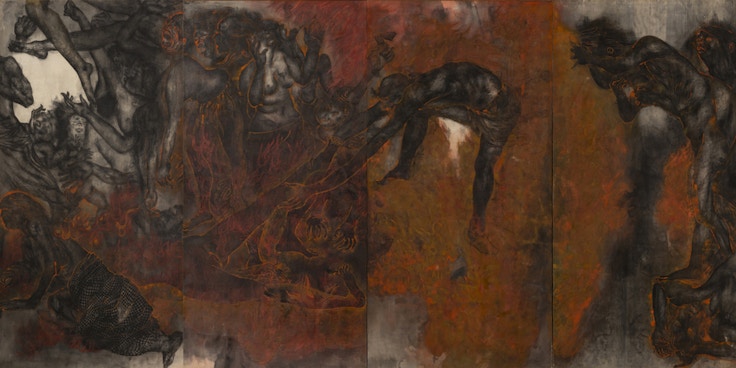 《原爆の図》は、水墨による独自の表現を探究していた丸木位里(1901〜95)と、油彩画を学んだ丸木俊(1912〜2000)が夫婦共同で描いた全15部からなる連作絵画。ふたりは原爆投下後の広島の惨状を見たのち、自らの体験と家族などから聞いた話をもとに《原爆の図》初期3部作である《第1部 幽霊》、《第2部 火》、《第3部 水》を制作した。報道規制が敷かれた時期にもかかわらず、日本全国を巡回し、いち早く人々に被爆の惨状を伝えたことで反核・反戦の象徴となっていく。