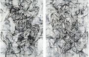 独自のモチーフ「クイックターン・ストラクチャー」を軸に展開される大山の絵画は、白と黒を中心としたモノトーンが基調。今回の個展は色彩の放棄、もしくは白黒への還元それ自体に言及するような内容だ。
