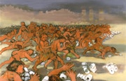 戦後活動を再開した福沢は、混乱する世相をダンテ『神曲』に託して表現し、代表作《敗戦群像》(1948)を発表。その後は52年に渡欧、56年に渡米し、中南米の風俗の原初的な生命力やアメリカの公民権運動のエネルギーに影響を受けた作品を制作する。
