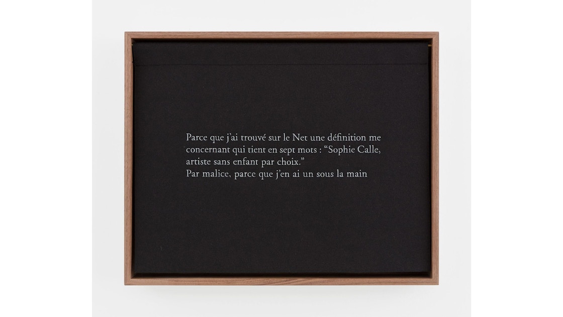 たとえば《Sans enfants, sein(子供なし、胸)》と題された作品では、「なぜなら、ネット上で私の説明が『ソフィ・カル、あえて子供をもたないアーティスト』とたった7 語でかたづけられてるのを見つけたから。ほんのお遊びとして、この子がたまたまここにいたから。」という言葉が刺繍された布の背後に、カルが子どもに授乳しているように見える写真が現れる。
