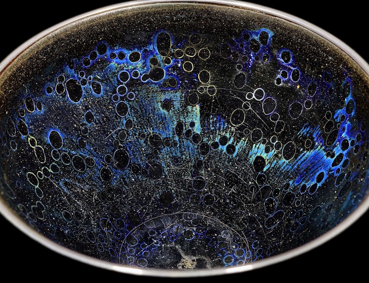 一番の見どころは、世界に3椀しか現存しないと言われる国宝《曜変天目茶碗》。曜変天目とは、12〜13世紀に中国でつくられた天目茶碗のうち、偶然に美しい光彩が生じたもののこと。宇宙に浮かぶ星のような輝きが現れる理由はいまだ解明されておらず、再現は不可能とされている。