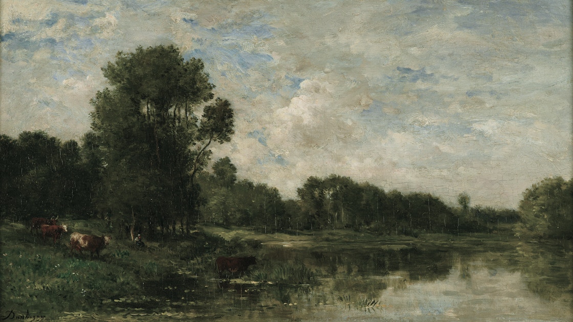 ドービニーは1817年のパリに生まれ、風景画家の父から手ほどきを受けて35年から画家を目指す。はじめは古典的な作品を描いたが、次第に身近な自然の美しさを表現することに専念するようになる。50年頃からはバルビゾン派の先駆けとなったカミーユ・コローと各地を旅し、共同で制作。2人は20歳近い年の差を超え、生涯を通じて親交を結んだ。
