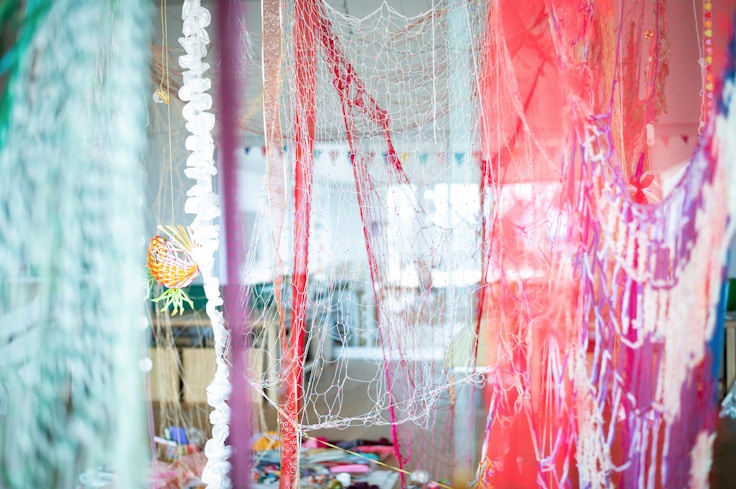 2012 95x90x90cm 東京駅で出逢ったいろいろな物と糸、切符、布に昇華印刷