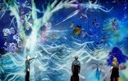本展に展示されるのは《世界は暗闇からはじまるが、それでもやさしくうつくしい》《Black Waves:埋もれ失いそして生まれる》《永遠の今の中で連続する生と死 II》。いずれもチームラボが厳選したプロジェクション作品だ。