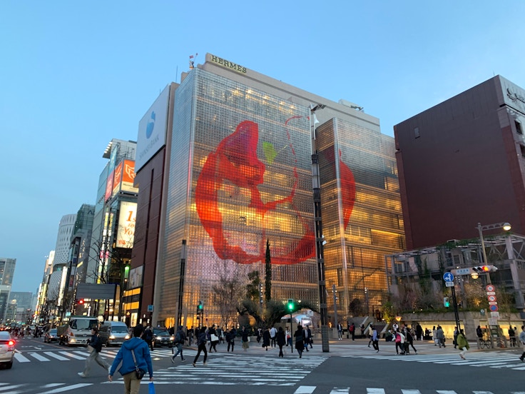 ファサードのペインティングにも注目。「うつろひ、たゆたひといとなみ」(銀座メゾンエルメス フォーラム)