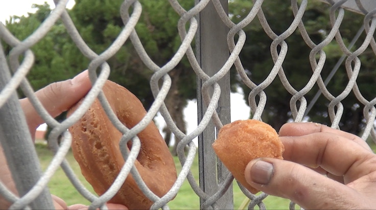 《完璧なドーナツをつくる》は、17~18年に沖縄を舞台として制作されたもので、キュンチョメが「アメリカのドーナツと沖縄のドーナツ(サーターアンダギー)を合体させて、完璧なドーナツを作ることはできないか」という疑問を、住民や沖縄と関わりのあるあらゆる人物に投げかける様子を記録。そこには基地問題などをめぐる様々な思いが渦巻き、その答えを出すことの難しさが可視化されている。